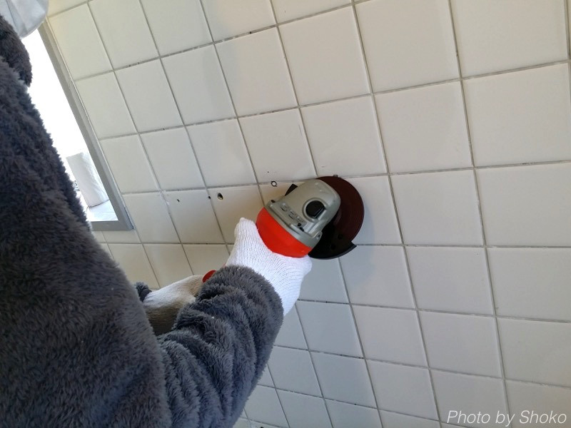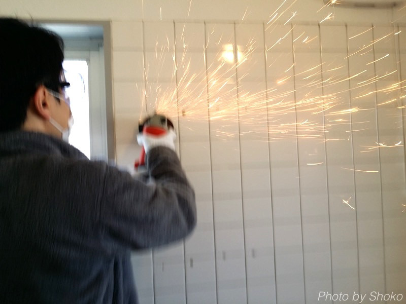 壁がでこぼこしていたので、「グラインダー」という機械で平にしているところです。