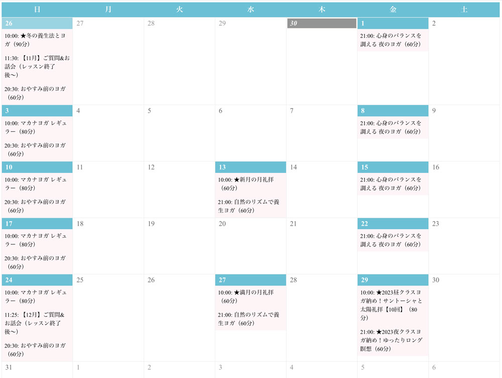 2023年12月、 オンラインヨガ・スケジュールのご案内です。