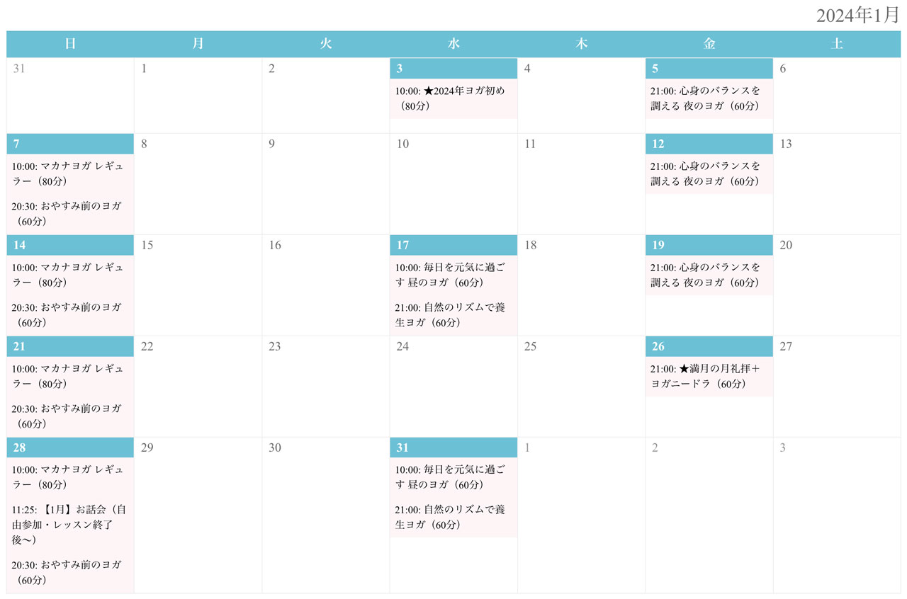 2024年1月、 オンラインヨガ・スケジュールのご案内です。