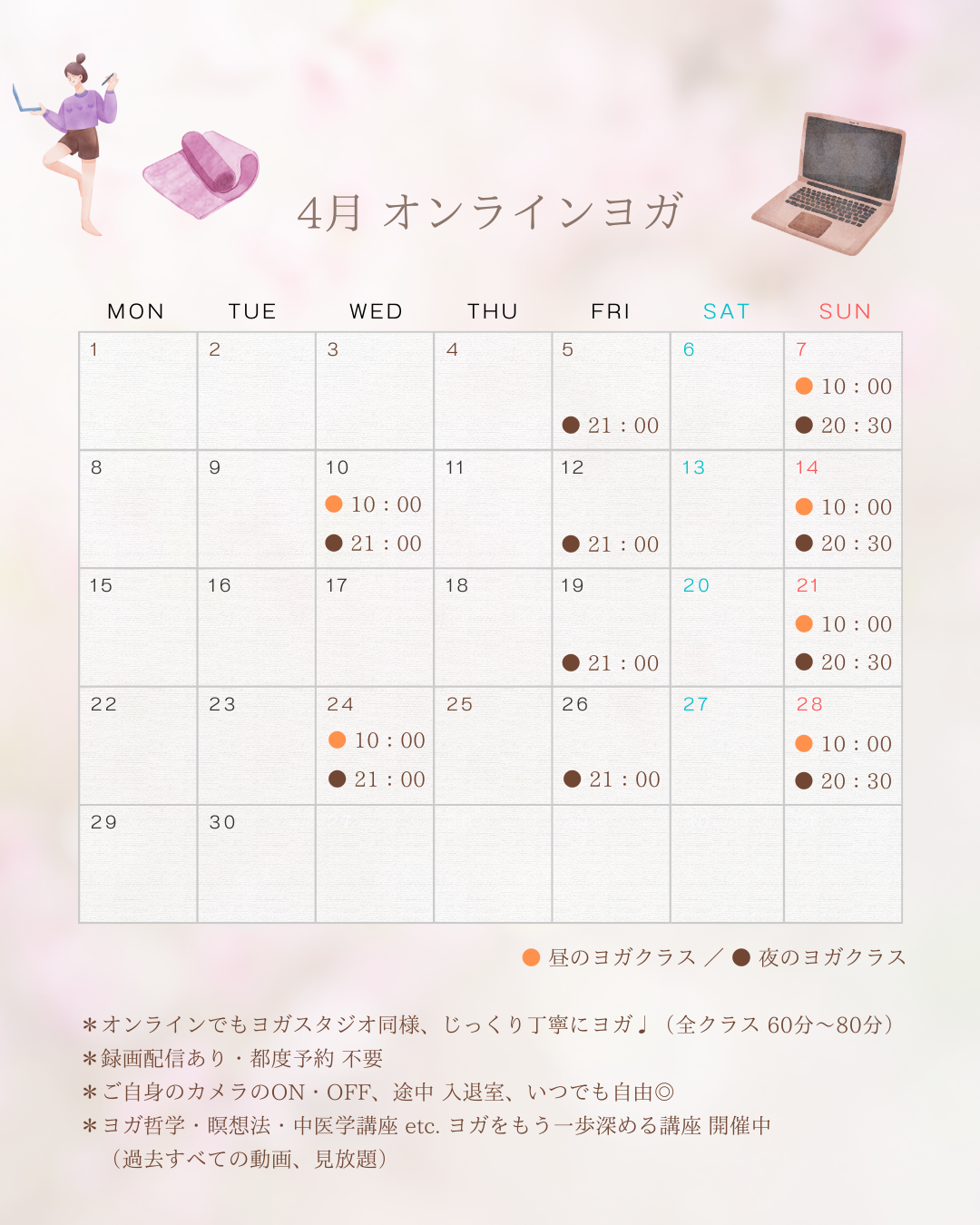 2024年4月、 オンラインヨガ・スケジュールのご案内です。