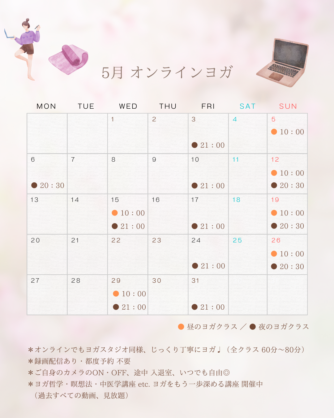 2024年5月、 オンラインヨガ・スケジュールのご案内です。