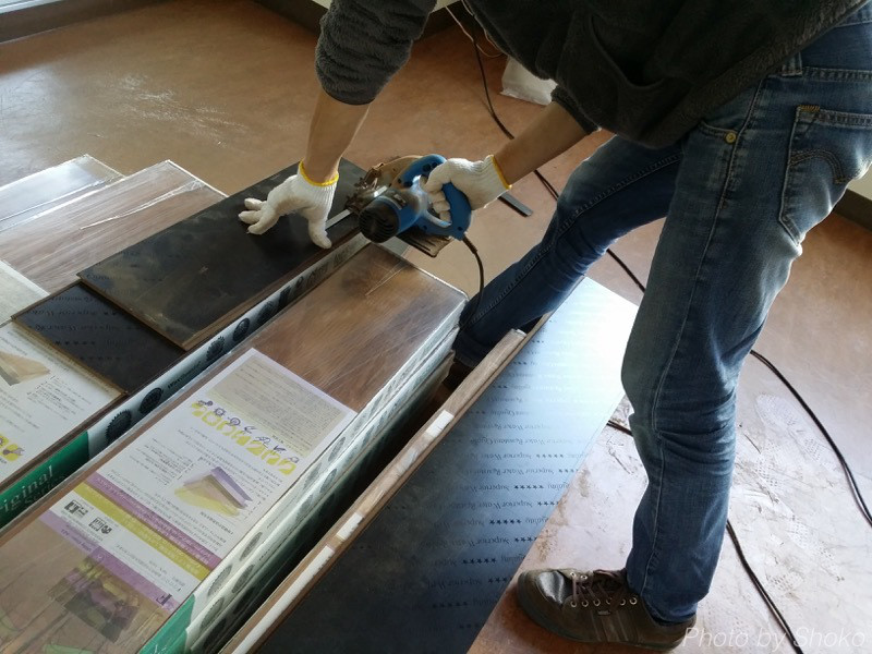 繋ぎ目をランダムにしたり、隅っこの半端部分は丸のこでカット…