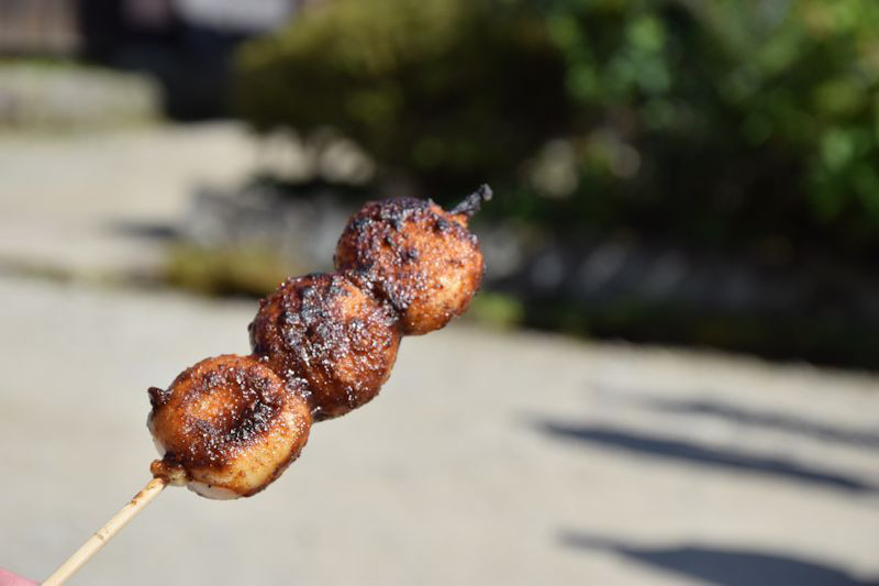 さっそくお店の前に腰掛け、「焼きだんご」とともに、お茶タイム。